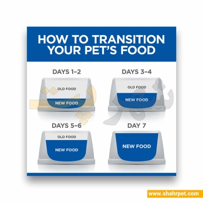 در هنگام تغییر غذای قدیمی به این محصول، طی ۷ روز مقدار بهتدریج جایگزین گردد.